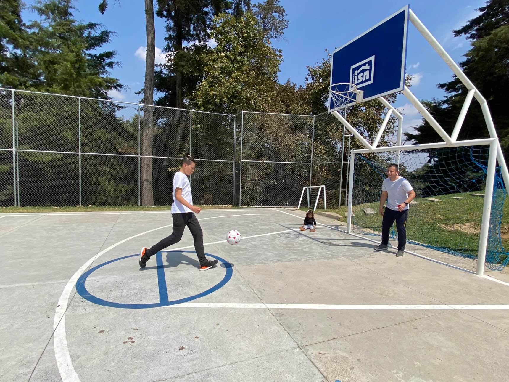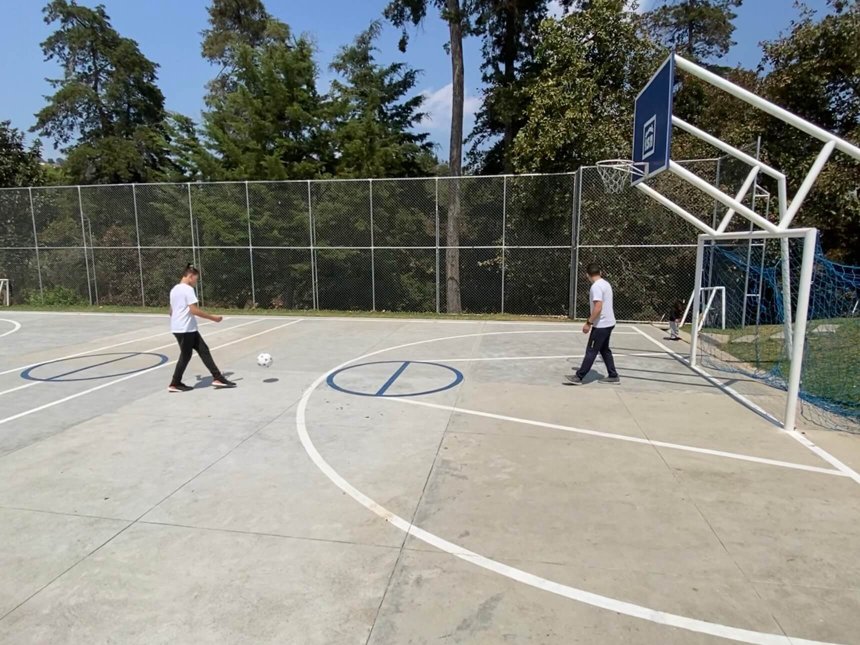Una cancha polideportiva que permite la práctica de una variedad de deportes, como fútbol, baloncesto y voleibol.